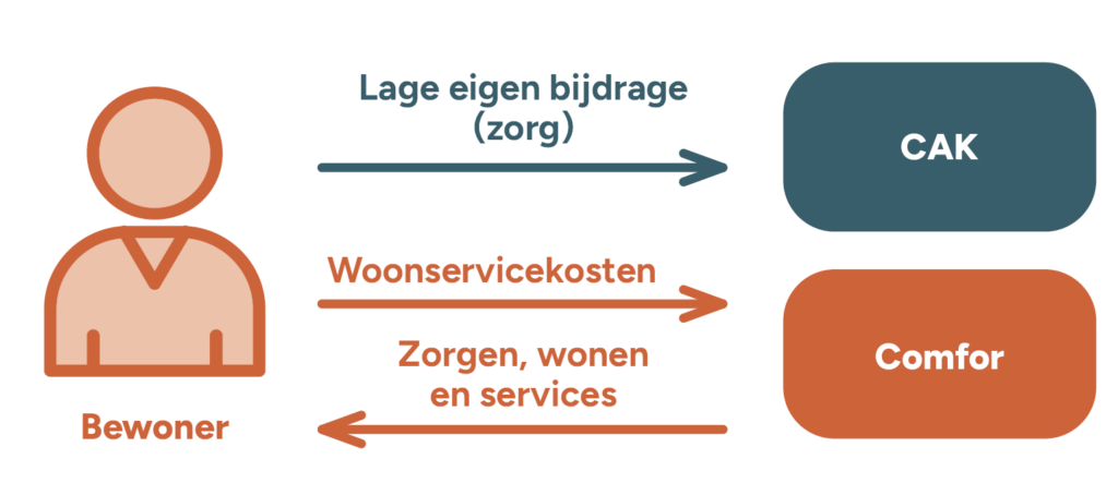 Bij Comfor is dit anders. Bewoners van D’n Hertog betalen altijd de lage eigen bijdrage aan het CAK. Dat komt doordat u bij ons zorg ontvangt maar voor wonen (en extra services) woonservicekosten rechtstreeks aan Comfor betaalt.