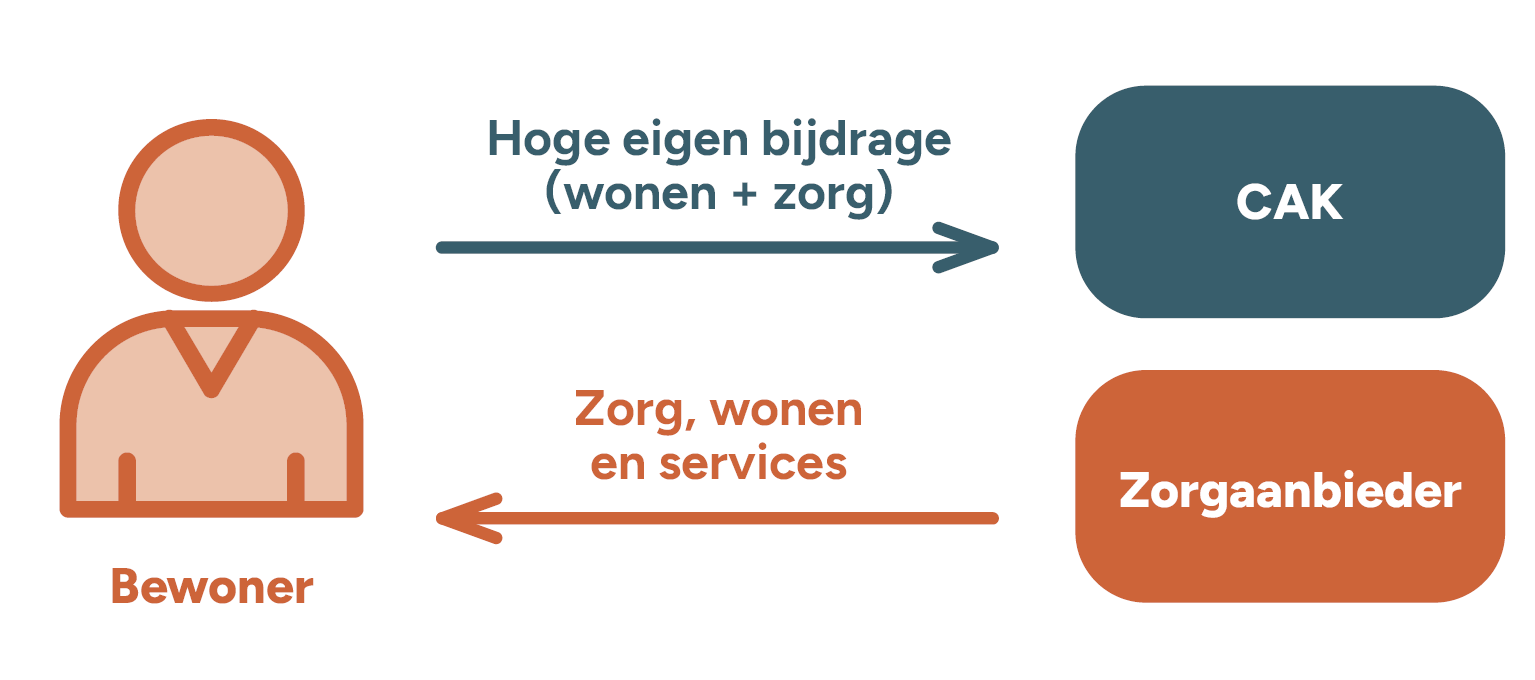 Bij een regulier verpleeghuis werkt het anders. Daar geldt de hoge eigen bijdrage voor de geleverde Wlz-zorg én wonen die aan het CAK wordt betaald. In het voorbeeld van mevrouw Jansen zou de eigen bijdrage niet € 254 maar € 1.265 per maand bedragen als ze in een regulier verpleeghuis in plaats van bij D’n Hertog zou wonen. Door te kiezen voor wonen bij D’n Hertog boven wonen in een regulier verpleeghuis betaalt mevrouw Jansen dus € 1.011 minder aan eigen bijdrage. Dat geld is beschikbaar voor de bij D’n Hertog te betalen woonservicekosten voor extra woonkwaliteit en services.